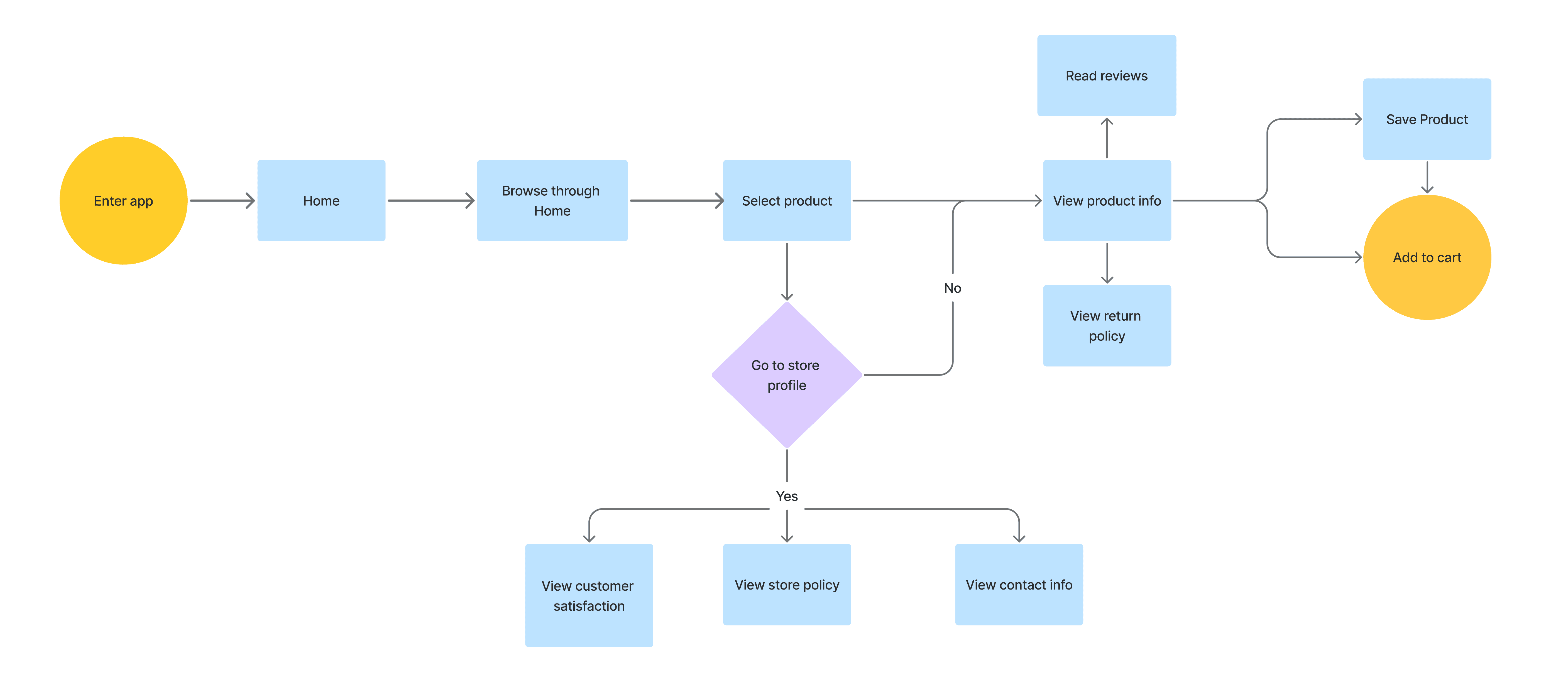 From the research gathered, I created a user flow to envision the path a user takes to view product and store information